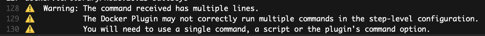 The buildkite-docker plugin warns that multiline commands instead of a single command may cause issues.